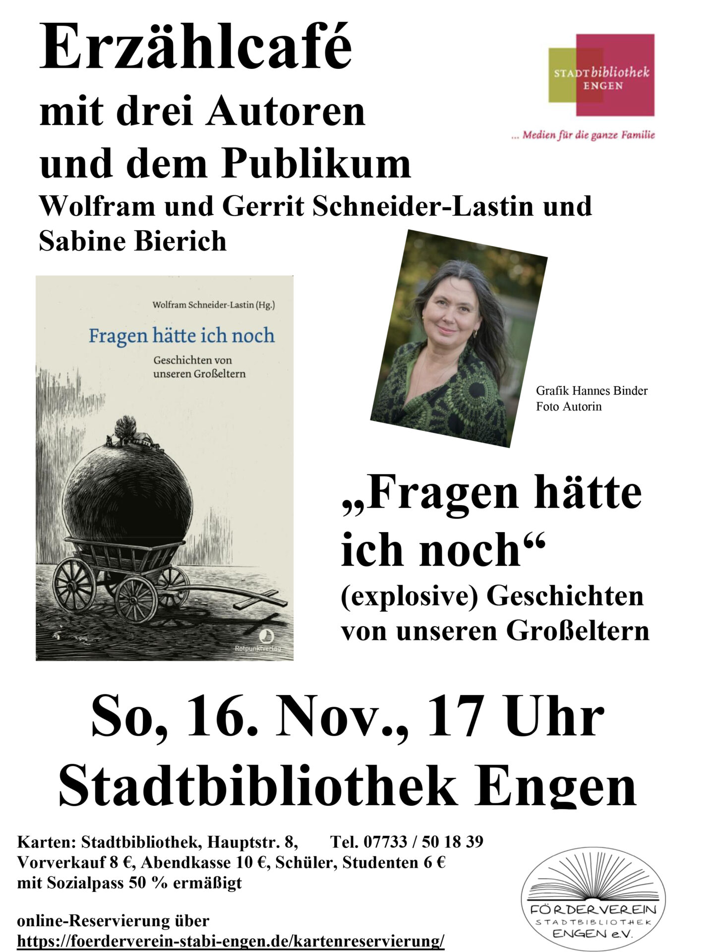 In der Stadtbibliothek Engen lesen ihre Geschichten die Schaffhauser Schriftstellerin und Schauspielerin Sabine Bierich, der Autor Gerrit Schneider-Lastin sowie der Schauspieler und Herausgeber des Buches Wolfram Schneider-Lastin.